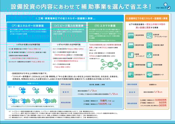 エネルギー使用合理化等事業者支援補助金は、事業者が計画した省エネルギーに係る取組のうち、「技術の先端性」、「省エネ効果」、「費用対効果」を踏まえて政策的意義が高いと認められる設備・システム更新を支援する。工場・事業場等における省エネ設備・システムへの入替や製造プロセスの改善等の改修により省エネや電力ピーク対策を行う際に必要となる費用を補助する。また、工場間で一体となった省エネの取組を支援対象に加える。